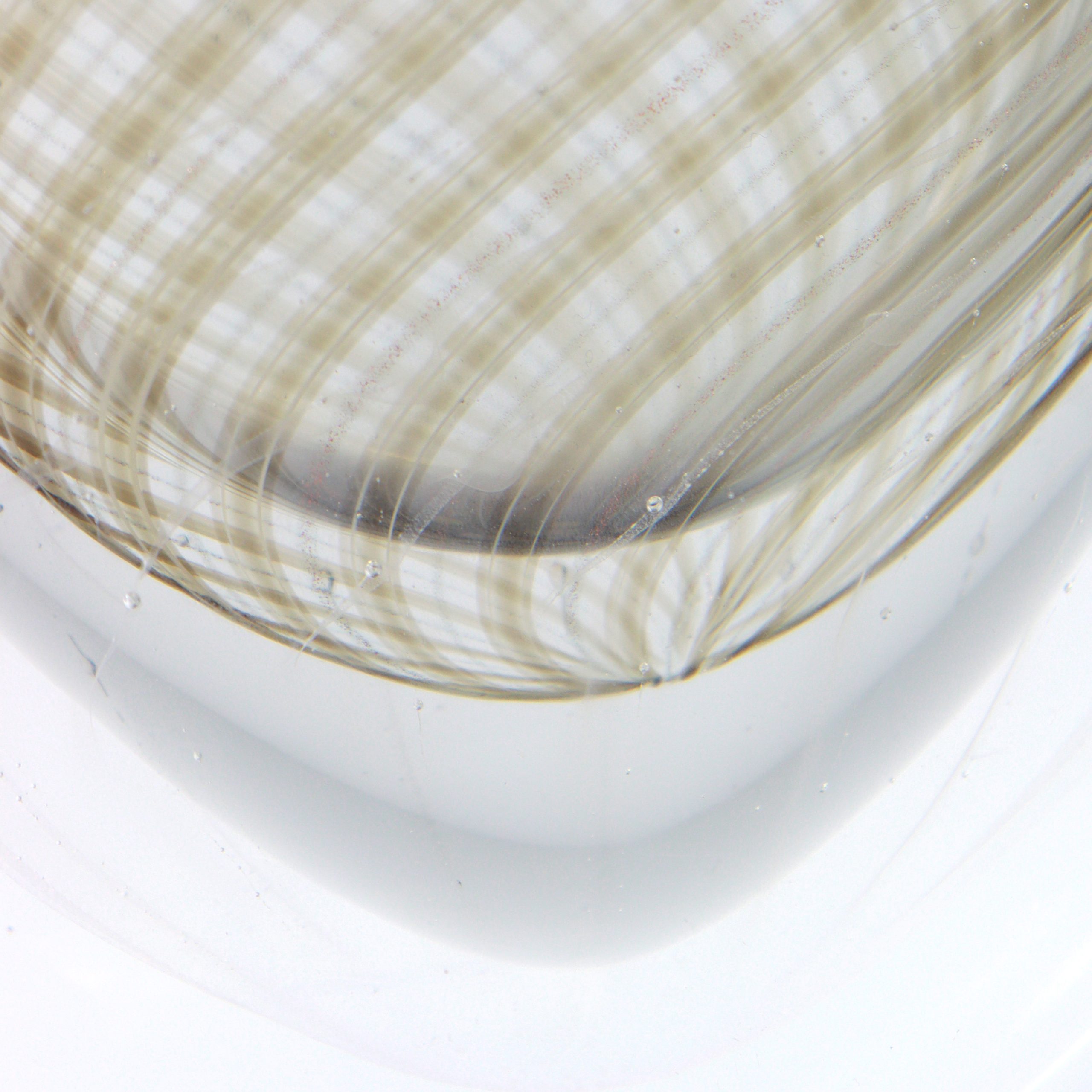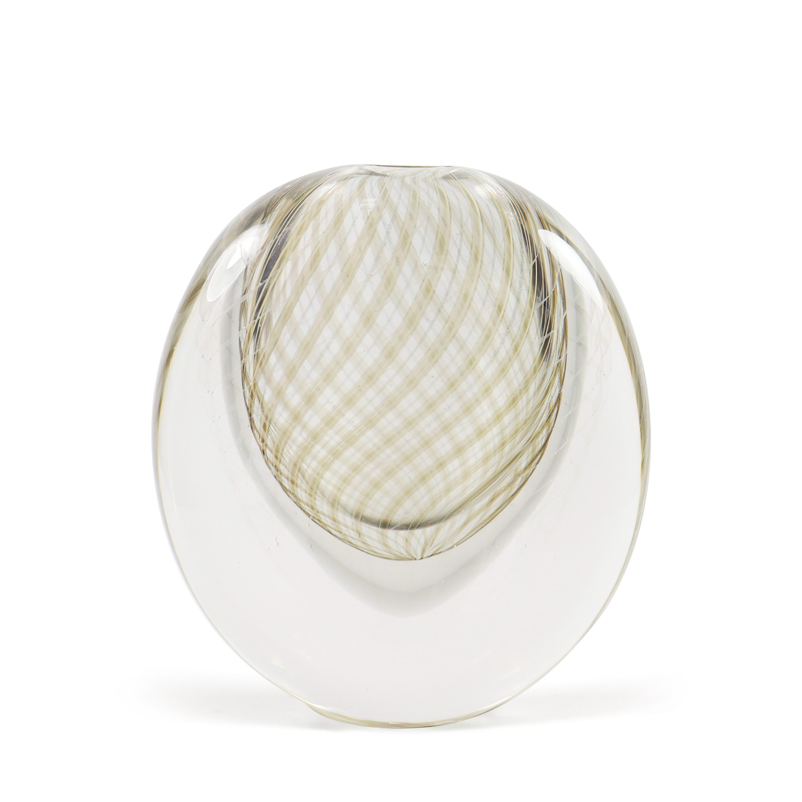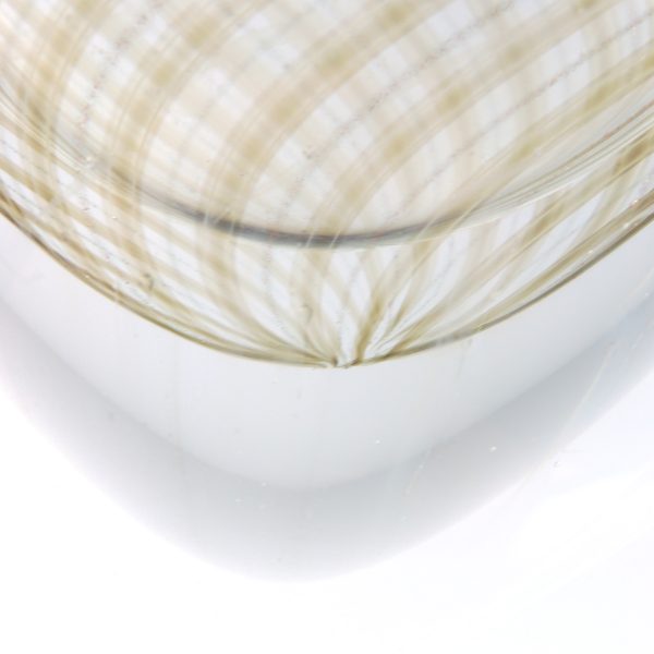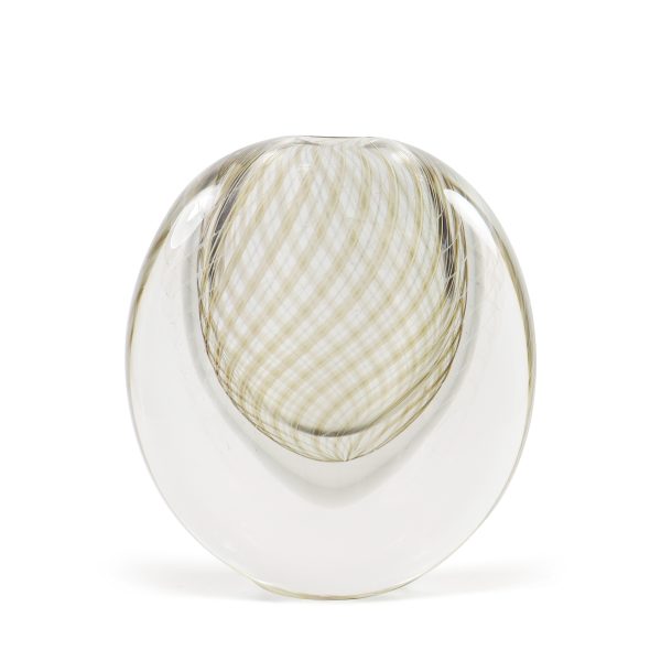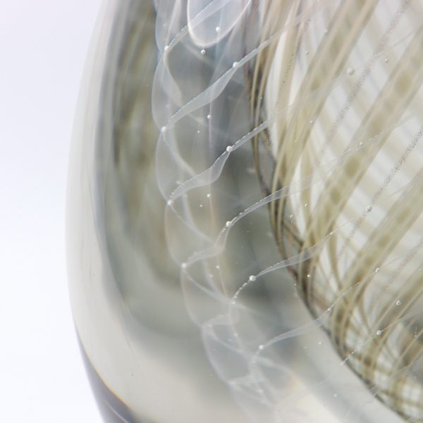 El jarrón Ormeggio es un ejemplo refinado del arte del vidrio de Murano, soplado a boca y elaborado con una elegancia atemporal. Su silueta ovalada y lineal se enriquece con un filigrana en espiral de varillas de vidrio blancas, taupe y aventurina, que se desplaza a través de una capa de vidrio gris suave y luego se sumerge bajo vidrio cristalino transparente.
