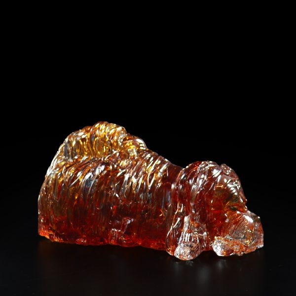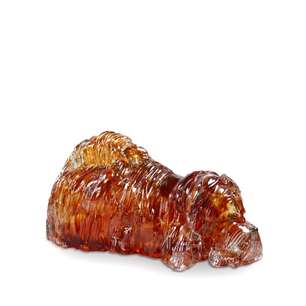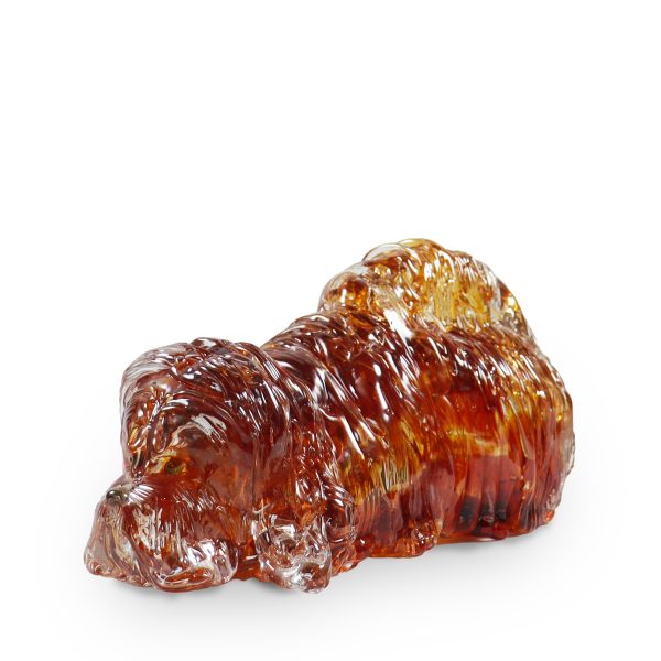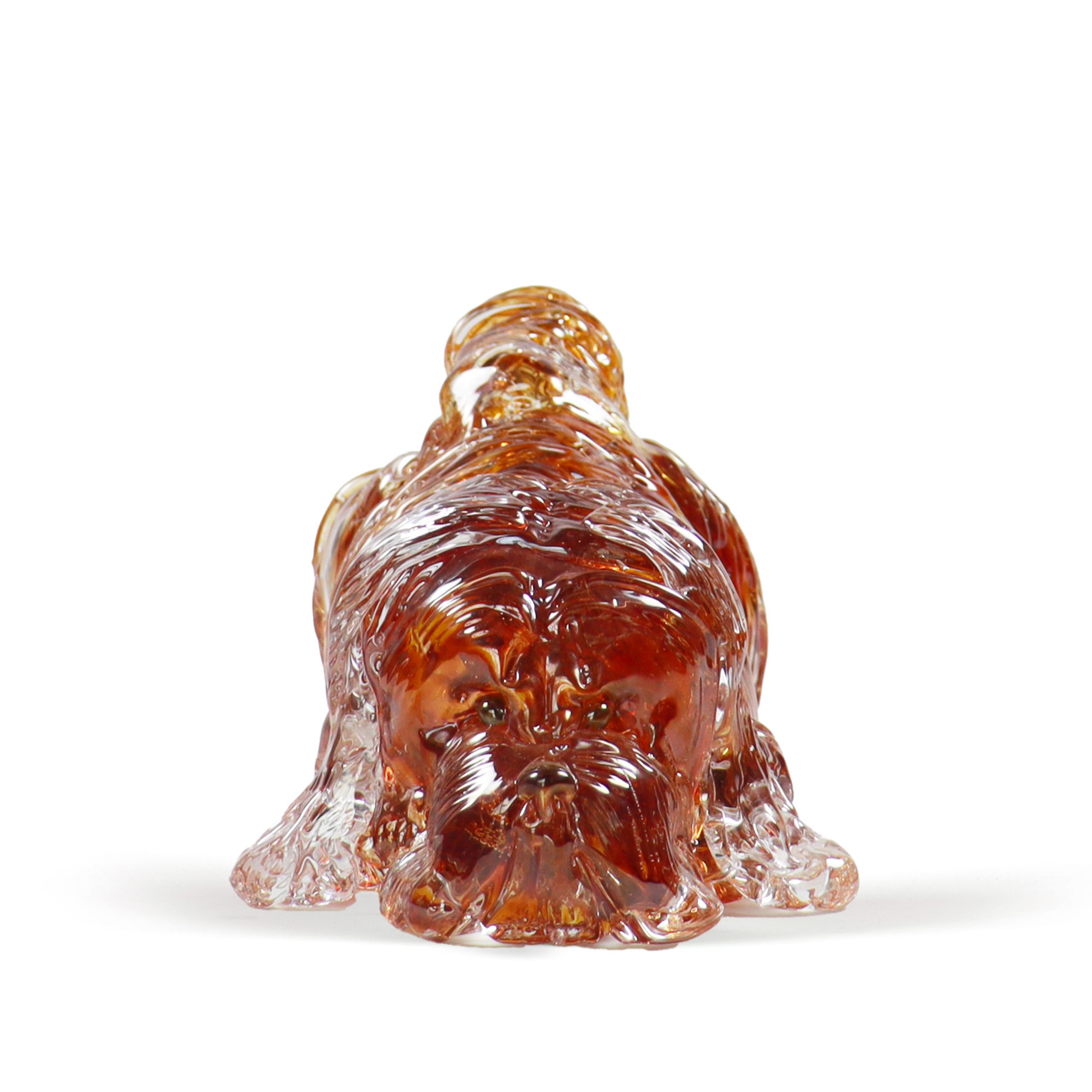 A charming tribute to “man’s best friend”, this exquisite Murano glass dog sculpture designed by Pierpaolo Seguso brings timeless elegance and warmth to any space. Expertly handcrafted from solid amber glass, the piece beautifully captures the long, flowing fur of a beloved pup through delicate texturing that reflects light with every curve.