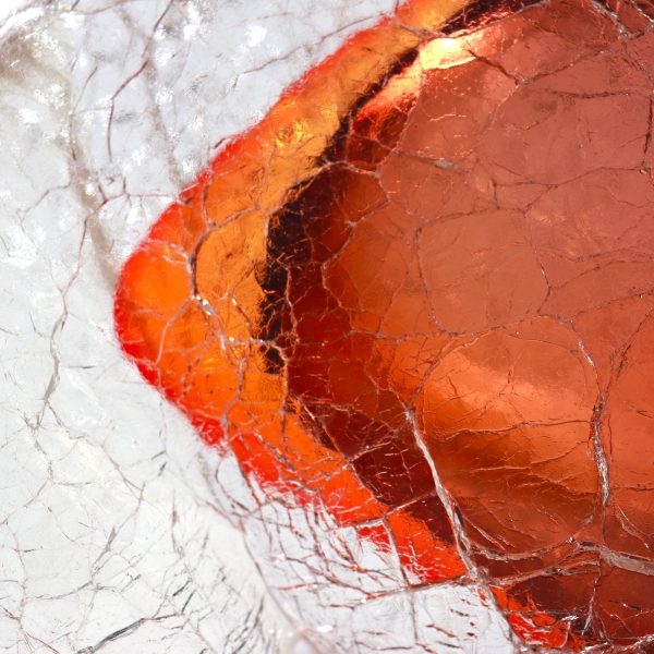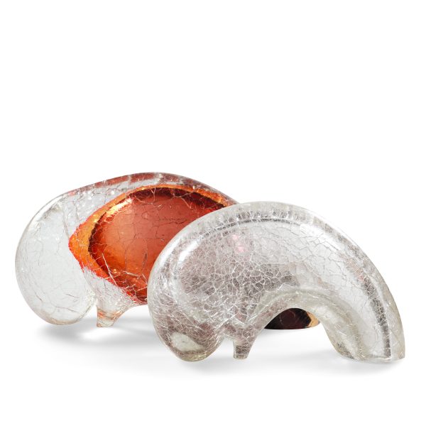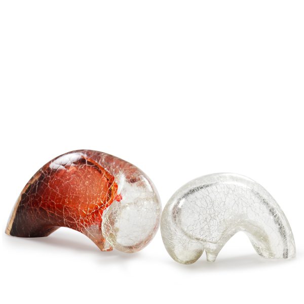This minimalist bison sculpture, handcrafted in amber colored glass submerged crystal clear with a unique craquelé finish, captures the raw, essential spirit of the wild. Its abstract silhouette suggests movement and power, while the warm amber tones and fine crackled texture give it a delicate, almost ethereal presence.